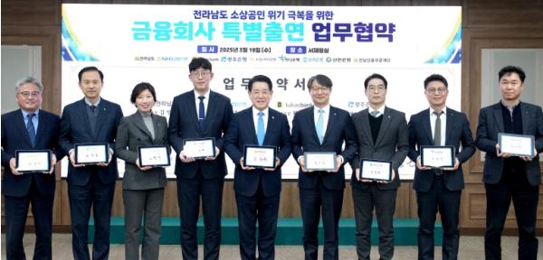 [중앙뉴스라인, 김민수기자] 전라남도는 소상공인의 경영위기 극복을 위해 19일 도청에서 전남신용보증재단, NH농협은행·카카오뱅크·광주은행·KB국민은행·하나은행·우리은행·신한은행 등 7개 금융회사와 함께 공동 특별출연 업무협약을 했다.
