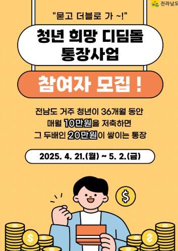 [중앙뉴스라인, 김민수기자] 전라남도는 오는 5월 2일까지 ‘2025년 청년 희망디딤돌 통장’ 사업의 신규 참여자를 모집하고, 적격심사를 거쳐 7월 총 825명을 최종 선정할 계획이라고 밝혔다.