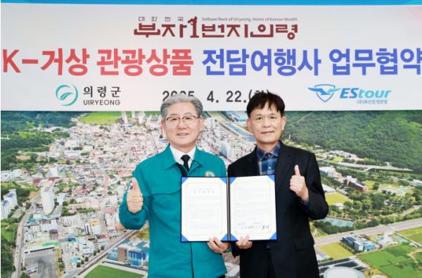 [중앙뉴스라인, 양병남기자] 의령군은 지난 22일 ㈜부산은성관광(대표 장영둘)과 손잡고 K-거상 관광루트 활성화를 위한 업무협약을 체결했다고 밝혔다.