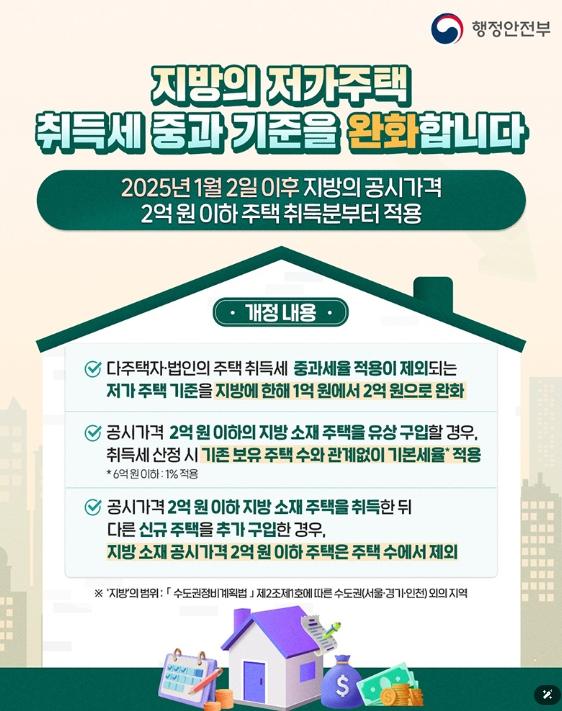 2025년 1월 2일 이후 지방의 공시가격 2억 원 이하 주택 취득분부터 적용