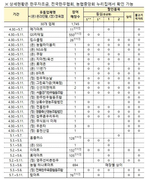 매장별 재고 사정에 따라 할인행사 참여 기간이 다르며, 자세한 참여매장과 매장별 할인행사 일정은 한우자조금(hanwooboard.or.kr)과 전국한우협회(ihanwoo.org), 농협중앙회(nonghyup.com) 누리집에서 확인이 가능하다.
