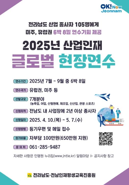 [중앙뉴스라인, 김민수기자] 전라남도와 전남인재평생교육진흥원은 ‘인재육성 고속도로’의 일환으로 추진 중인 2025년 산업인재 글로벌 현장연수 참가자를 오는 7일까지 모집한다.