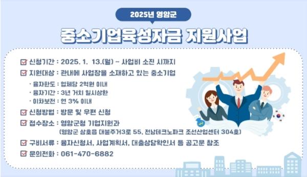 [중앙뉴스라인, 전은희기자] 영암군이 중소기업의 경영안정과 경쟁력 강화를 위한 ‘2025년도 중소기업육성자금 이차보전금 지원사업’ 참여 기업을 추가 모집한다.