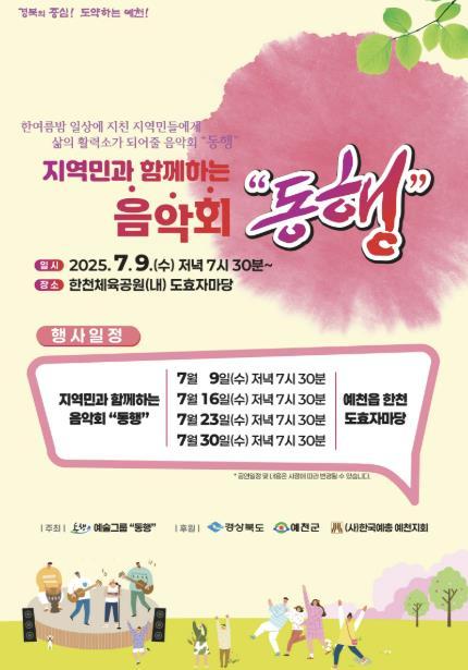 동행 음악회는 매년 여름 예천군민을 대상으로 개최되어 지역민의 문화생활 향유 및 소통의 장을 제공해 왔으며 올해도 한여름밤을 음악으로 채우는 지역 대표 음악회로 기대를 모으고 있다.