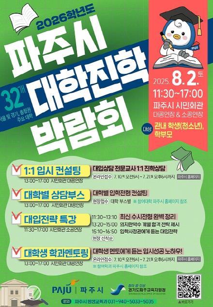 [중앙뉴스라인, 우제헌기자] 파주시는 오는8월2일 파주시민회관 대공연장 및 소공연장에서 녪학년도 대학 진학 박람회’를 개최한다.