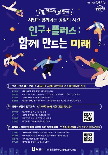 [중앙뉴스라인, 우제헌기자] 부천시는 7월 11일 인구의 날을 맞아, 7월 한 달간 ‘인구+플러스: 함께 만드는 미래’행사를 연다. 이번 행사는 시민과 함께하는 인식개선 캠페인, 인구교육, 가족친화기업 육성 토론회 등 다양한 프로그램으로 진행된다.