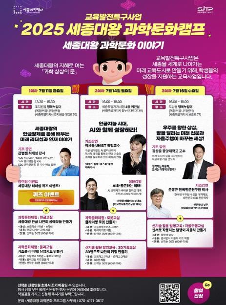 [중앙뉴스라인, 우제헌기자] 세종특별자치시가 오는 11일부터 16일까지 교육발전특구사업의 일환으로 학생들의 과학적 사고력과 창의성을 키우기 위한 ‘2025 세종대왕 과학문화캠프’를 3회에 걸쳐 개최한다.