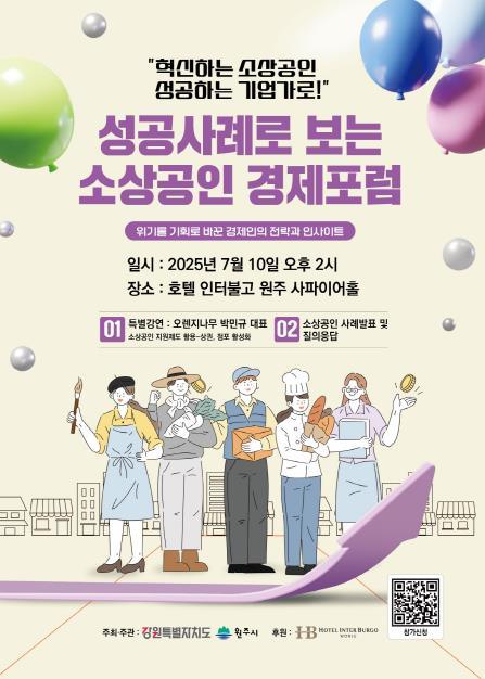 [중앙뉴스라인, 우제헌기자] 원주시와 강원특별자치도는 오는 10일 오후 2시 호텔인터불고 원주에서 제1회 ‘성공사례로 보는 소상공인 경제포럼’을 개최한다.