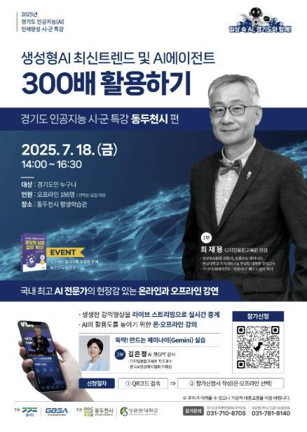 [중앙뉴스라인, 우제헌기자] 동두천시는 오는 18일 오후 2시부터, 경기도와 경기도경제과학진흥원이 주최하고 동두천시와 성균관대학교가 주관하는 ‘생성형 인공지능(AI) 특별강연’을 동두천시 평생학습관에서 개최한다고 밝혔다.