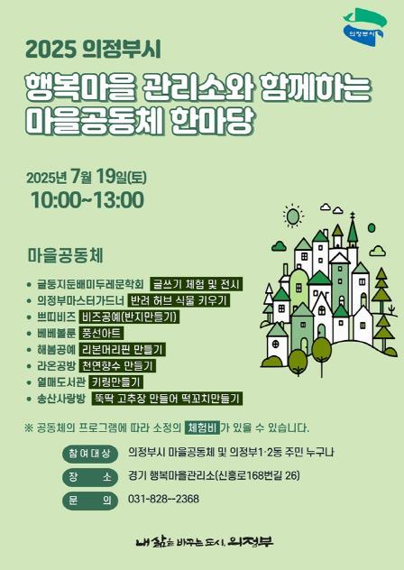 [중앙뉴스라인, 우제헌기자] 의정부시는 오는 7월 19일 의정부시 경기 행복마을관리소(신흥로168번길 26)에서 ‘행복마을관리소와 함께 하는 마을공동체 한마당’ 행사를 개최한다.