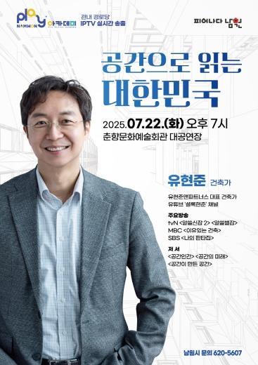 [중앙뉴스라인, 우제헌기자] 남원시는 22일 오후 7시, 춘향문화예술회관 대공연장에서 대한민국을 대표하는 건축가 유현준 교수를 초청하여 “공간으로 읽는 대한민국”이라는 주제로 강연을 개최한다.