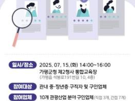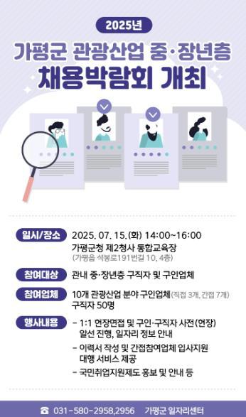 [중앙뉴스라인, 우제헌기자] 가평군은 오는 15일 제2청사 4층 통합교육장에서 ‘2025년 중장년층 관광산업 채용박람회’를 개최한다고 밝혔다.