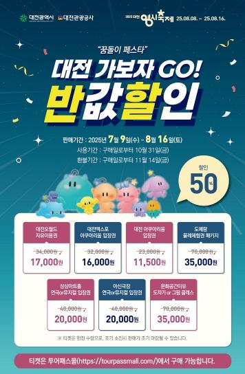 대전시는 대전관광공사와 함께 7월 9일부터 ‘대전 가보자 GO! 반값 할인’ 프로모션을 시작한다고 밝혔다. 이번 행사는 8월 8일부터 16일까지 열리는 ‘대전 0시 축제’에 앞서, 대전의 주요 관광지와 체험시설을 반값에 즐길 수 있는 기회를 제공한다.