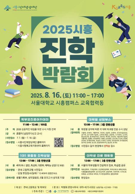 [중앙뉴스라인, 우제헌기자] 시흥시는 시흥시인재양성재단이 시 교육자치과, 시흥진로체험지원센터, 시흥교육지원청과 공동 주관으로 오는 8월 16일 오전 11시부터 오후 5시까지 서울대학교 시흥캠퍼스 교육협력동에서 ‘2025년 시흥 진학 박람회’를 개최한다고 9일 밝혔다.
