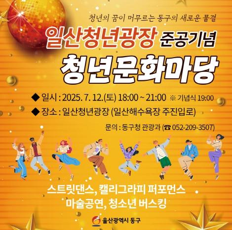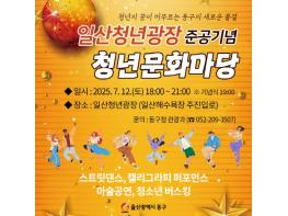 동구는 일산해수욕장 중앙광장형 보행로의 명칭을 ‘일산청년광장’으로 정하고, 오는 12일 오후 7시에 준공식을 기념해 청년문화마당을 마련한다. 이날 청년문화마당에는 ‘더아트’의 스트릿댄스 공연과 캘리그라피 퍼포먼스, 마술공연, 청소년 버스킹 등 청년 문화예술가가 참여하는 공연이 열린다.