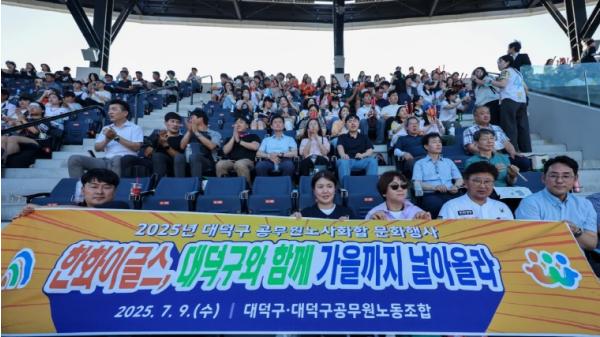 [중앙뉴스라인, 우제헌기자] 대전 대덕구는 9일 노사 간 화합을 위해 대전한화생명볼파크에서 200여 명의 직원이 함께 프로야구 경기를 관람했다고 밝혔다.