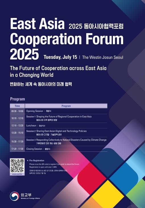 [중앙뉴스라인, 신기철기자] 외교부는 “변화하는 세계 속 동아시아의 미래 협력”을 주제로 한 '2025 동아시아협력포럼'을 7월 15일 서울(웨스틴조선)에서 개최한다.