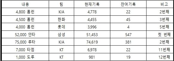 KBO 리그 타자 누적 기록에서 빠지지 않는 LG 김현수는 통산2,500안타와 1,500타점을 가시권에 두고있다. 통산 2,476개의 안타를 기록하고 있는 김현수는 안타 24개를 기록할 시 역대 4번째 2,500안타 달성 선수가 되며, 10타점을 추가하면 역대 3번째 1,500타점 선수가 된다.