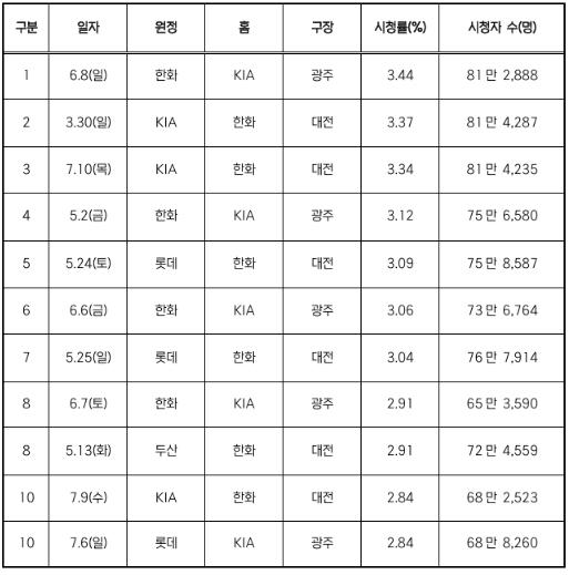 한편, 시청률 3%를 넘긴 경기는 총 7경기로 KIA-한화 간의 경기가 5차례, 롯데-한화간의 경기가 2차례 있었다. 2024 시즌 전반기에는 시청률 3%를 넘긴 경기가 전무했다. 시청률 2%를 넘긴 경기는 총 47경기로 지난 시즌 전반기의 26경기에 비해 크게 늘어났다.