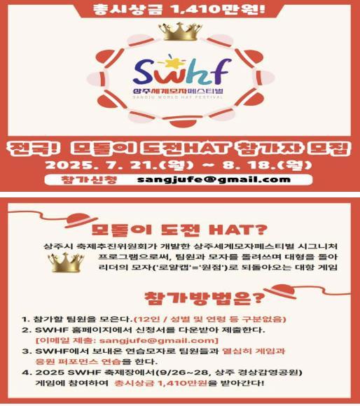 [중앙뉴스라인, 우제헌기자] 상주시 대표축제 상주세계모자페스티벌의 대표 프로그램 중 하나인 ‘모돌이 도전 HAT(별칭 모돌이게임)’이 대국민참여 전국대회로 2025 상주세계모자페스티벌에서 개최된다.