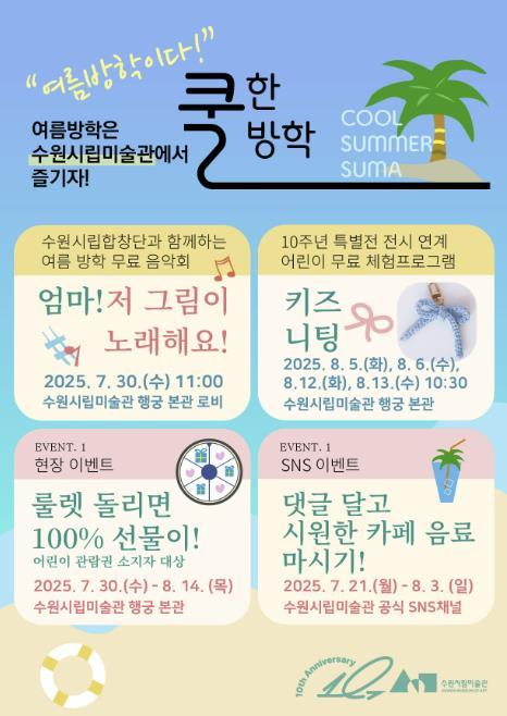수원시립미술관 관계자는 “유난히 더위가 일찍 찾아온 여름 수원시립미술관의 전시와 프로그램을 통해 알찬 방학을 보내며 새 학기를 준비하길 바란다”라고 밝혔다.