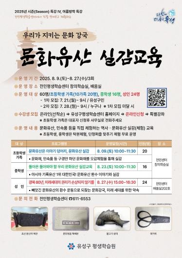 교육에서는 ▲조선 문인 송시열의 ‘송자대전’ 목판 ▲직지·훈민정음 해례본(영인본) ▲고구려 수막새 ▲고려 청동 수저와 민속품 ▲등잔대와 쇳대 등을 직접 만져보고 탐구하며 문화유산을 생생하게 체험하게 된다. 또한, 어린이와 청소년에게는 문화유산 퍼즐 맞추기, 탁본 체험 등을 통해 교육 효과와 흥미를 높일 계획이다.