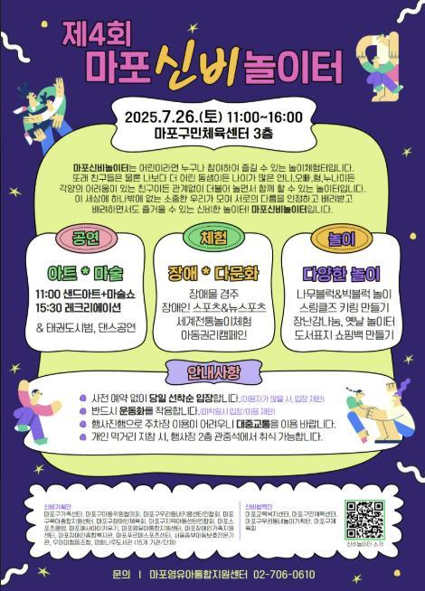 [중앙뉴스라인, 우제헌기자] 마포구는 7월 26일 토요일 오전 11시부터 오후 4시까지 마포구민체육센터에서 아동을 위한 통합놀이문화축제 ‘제4회 마포 신비놀이터’를 개최한다.