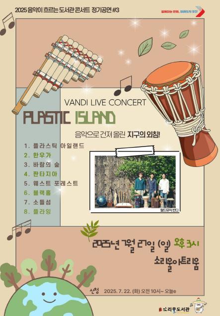 [중앙뉴스라인, 우제헌기자] 오산시는 소리울도서관이 오는 7월 27일 오후 3시, 소리울아트리움에서 *'2025 음악이 흐르는 도서관 콘서트' 정기공연 #3 – 월드뮤직 콘서트 『Plastic Island』*를 개최한다고 밝혔다.