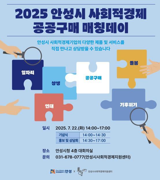 [중앙뉴스라인, 우제헌기자] 안성시가 취약계층에게 다양한 일자리와 사회서비스를 제공하고, 환경, 돌봄, 먹거리 등 지역의 다양한 문제를 해결하는 사회적경제 기업의 제품 및 서비스 사용 확대를 위한 ‘2025년 안성시 사회적경제 공공구매 매칭데이’를 7월 22일 안성시청 대회의실에서 진행한다.