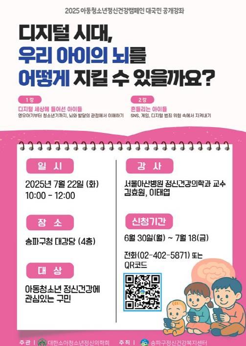 서울 아동·청소년 인구 최다 자치구인 송파구는 매년 아이들의 정신건강을 위한 강좌를 열고 있다. 올해는 첨단기술의 발전과 함께 성장하는 자녀 세대의 특성을 이해하고, 위험에서 지켜내도록 돕는 학부모 대상 공개강좌를 마련했다. 대한소아청소년정신의학회가 주최하고, 구 보건소와 송파구정신건강복지센터가 주관한다.