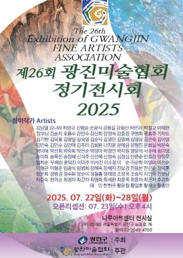 [중앙뉴스라인, 우제헌기자] 광진구는 광진미술협회가 7월 22일부터 28일까지 나루아트센터 1층 전시실에서 ‘제26회 광진미술협회 정기 전시회’를 개최한다고 밝혔다.