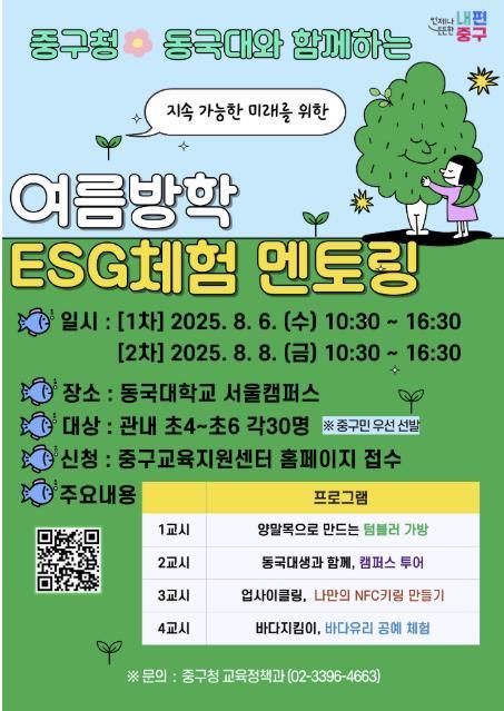 [중앙뉴스라인, 우제헌기자] 서울 중구가 여름방학 중인 초등학생들을 위해 동국대학교와 함께 ‘원데이 ESG 체험 멘토링’을 운영한다.