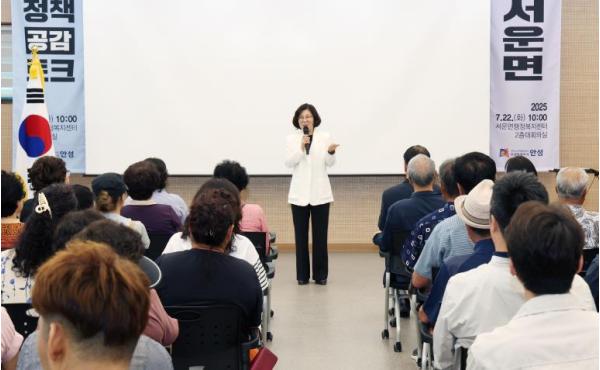 [중앙뉴스라인, 우제헌기자] 지난 22일 서운면은 서운면행정복지센터 2층 대회의실에서 주민들과 김보라 안성시장이 함께하는 “2025년 하반기 서운면 정책공감토크”행사를 성공적으로 마무리했다.