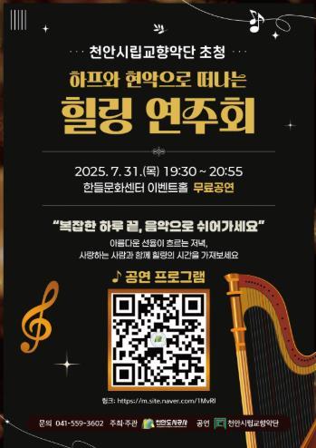 [중앙뉴스라인, 우제헌기자] 천안도시공사는 오는 7월 31일 한들문화센터에서 ‘시민과 함께하는 힐링 연주회’를 개최한다고 24일 밝혔다.