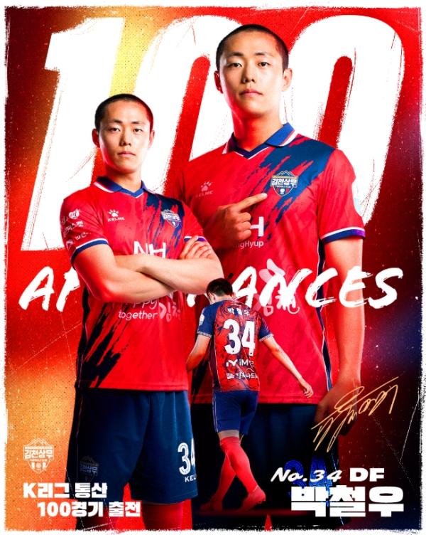 김천상무프로축구단(대표이사 이재하, 국군체육부대장 진규상)이 7월 22일, ‘하나은행 K리그1 2025’ 23R 광주전에 나서며 K리그 통산 100경기 출전을 달성했다. 박철우는 “데뷔했을 때가 엊그제 같은 벌써 이렇게 100경기를 달성하게 됐다. 정말 감사하다. 나를 응원해 주시고 믿어주시는 모든 분을 위해 여기서 만족하지 않고 몸과 마음이 다 할 때까지 최선을 다해 뛰겠다.”라고 소감을 밝혔다.
