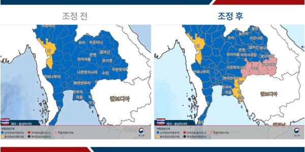 캄보디아의 경우, △오다르메안체이주, △프레아비헤아르주에 대해 특별여행주의보를, △반테아이메안체이주, △파일린주, △바탐방주, △푸르사트주, △코콩주에 대해 2단계(여행자제) 여행경보를 각각 발령했다.