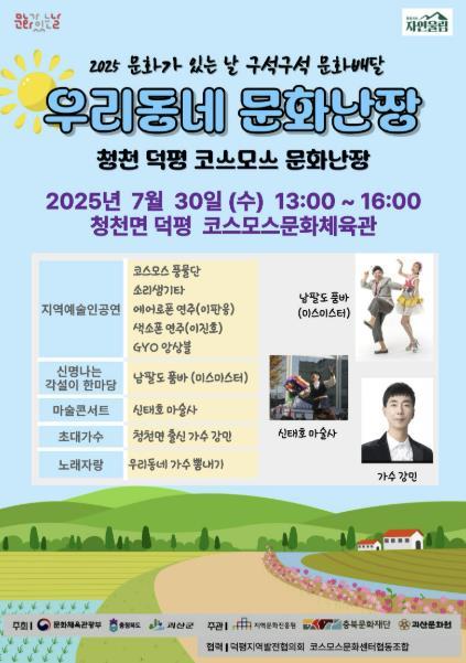 오는 7월 30일 오후 1시부터 열리는 이번 행사는 “청천 덕평 코스모스 문화난장”이라는 주제로 진행되며, 지난 5월 덕평리에 개관한 코스모스문화체육관에서 열려 무더위를 식히는 실내 문화행사로 꾸며질 예정이다.