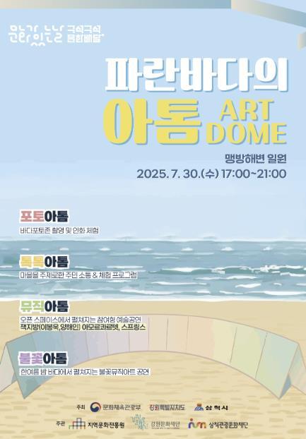 (재)삼척관광문화재단은 오는 7월 30일 오후 5시부터 9시까지 근덕면 맹방해수욕장 일원에서 어촌마을 주민과 관광객을 대상으로 ‘문화가 있는 날, 구석구석 문화배달 - 파란 바다의 아톰(ART DOME)’ 프로그램을 운영한다.
