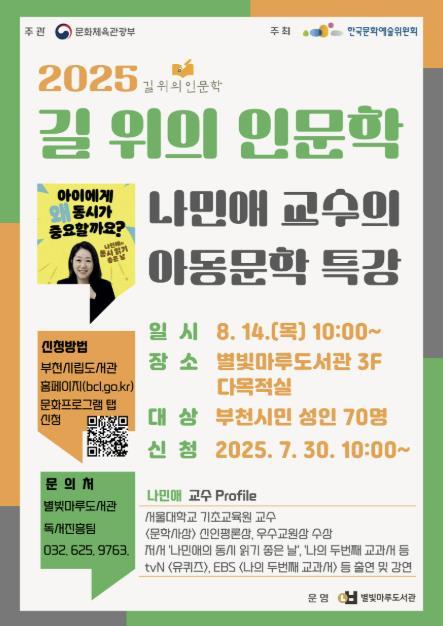 [중앙뉴스라인, 우제헌기자] 부천시는 8월 14일 오전 10시, 부천시립별빛마루도서관에서 서울대학교 나민애 교수를 초청해 아동문학 특강을 연다고 밝혔다.