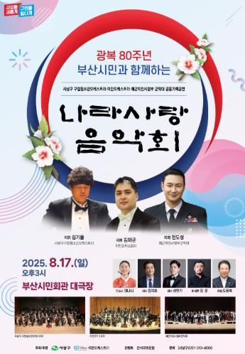 [중앙뉴스라인, 우제헌기자] 부산 사상구는 이안오케스트라, 해군작전사령부 군악대와 광복80주년을 맞아 오는 8월 17일 오후 3시 부산시민회관 대극장에서 ‘광복80주년, 부산시민과 함께하는 나라사랑 음악회’를 개최한다.