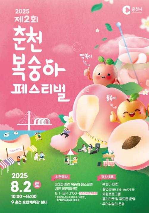 행사장 곳곳에선 복숭아 포토존, 플리마켓, 푸드트럭 등 볼거리와 먹거리도 풍성하게 준비된다. 복숭아 구매자에겐 춘천 복숭아 마스코트인 ‘딱복이·물복이’ 키링이 증정된다.