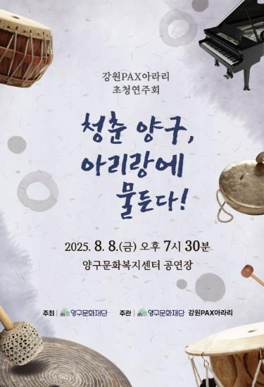 [중앙뉴스라인, 우제헌기자] 양구문화재단은 오는 8월, 지역 주민들의 문화 향유 기회를 확대하고 예술적 감성을 채워줄 기획공연 두 편을 양구문화복지센터 공연장에서 선보인다. 첫 번째 공연은 8월 8일 오후 7시 30분에 열리는 앙상블 공연 '강원PAX아라리'이며, 두 번째 공연은 8월 16일 오후 2시와 5시에 1일 2회 진행되는 가족 뮤지컬 '페페의 꿈'이다.