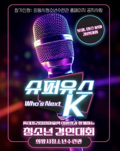 [중앙뉴스라인, 우제헌기자] 의왕시청소년재단 산하 의왕시청소년수련관은 오는 8월 1일부터 14일까지 만 13~18세 청소년을 대상으로 롯데프리미엄아울렛 의왕점과 함께하는 청소년 경연대회 '슈퍼유스 K' 참가자를 모집한다.