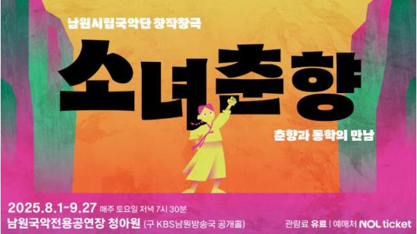 남원시립국악단이 오는 8월 1일과 2일 저녁 7시 30분, 청아원의 개관을 맞아 창작창극 '소녀춘향'을 무료로 공연한다.
