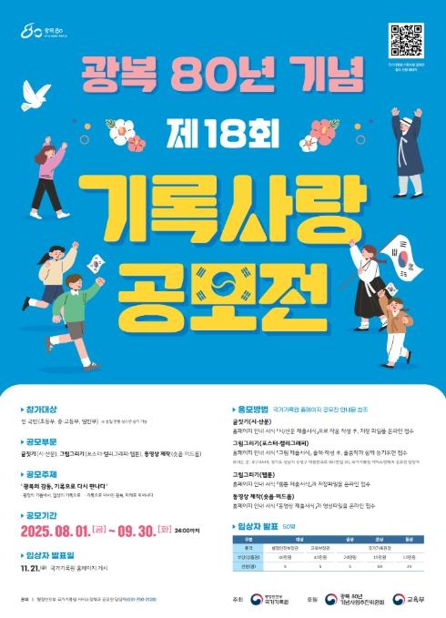 국가기록원이 주최하고, ‘광복 80년 기념사업추진위원회’와 교육부가 후원하는 이번 공모전은 ‘기록으로 다시 만나는 광복의 감동’을 주제로, 초등부, 중·고등부, 일반부로 나누어 실시한다.