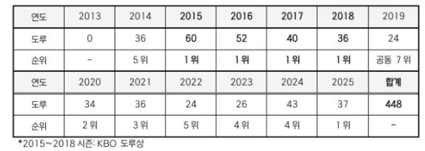 - KBO 리그 역대 5번째 450도루 달성 임박