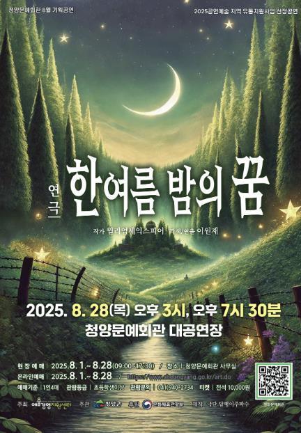 [중앙뉴스라인, 우제헌기자] 청양군이 오는 28일 오후 3시와 7시 30분 2회에 걸쳐 청양문예회관 대공연장에서 연극 ‘한여름 밤의 꿈’을 선보인다.