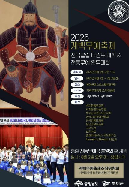[중앙뉴스라인, 우제헌기자] ‘2025 계백무예축제’가 오는 8월 2일부터 3일까지 2일간 부여군 유스호스텔 대강당에서 열린다.