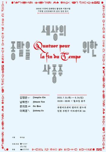 [중앙뉴스라인, 우제헌기자] 부평구 문화재단은 오는 24일까지 부평아트센터 갤러리꽃누리에서 제4회 부평 신진 큐레이터 공모 당선 전시 ‘세상의 종말을 위한 사중주’를 개최한다.