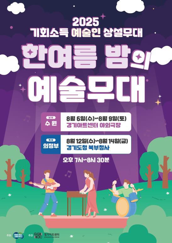 [중앙뉴스라인, 우제헌기자] 경기도는 8월 6~9일 경기아트센터 야외극장(수원)에서, 12~14일 경기도청 북부청사 경기평화광장(의정부)에서 오후 7시 기회소득 예술인과 도민이 함께 즐기는 특별한 예술공연 ‘한여름밤의 예술무대’를 무료로 진행한다.